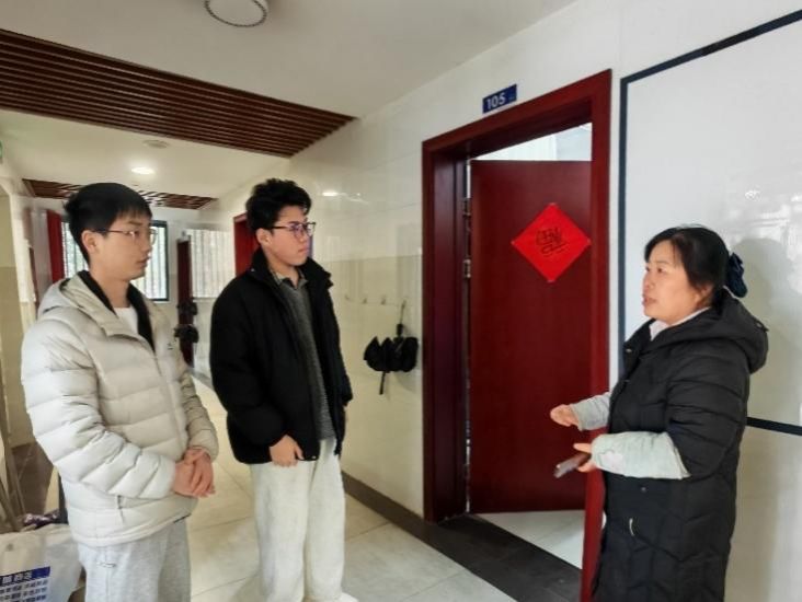 在劳动间隙,学员们与宿管阿姨亲切交流。宿管阿姨向大家介绍了每日的工作流程:从清晨的楼道巡查、晚间的安全提醒,到定期检查水电设施、协助学生登记报修等。“钥匙的存放、早出晚归的登记,都关系到同学们的安全。”一位阿姨轻声说道,“看到同学们平平安安地进出,在干干净净的环境里学习生活,我们再累也踏实。”学员们也关切询问阿姨的工作时长与休息安排,了解到她们常常轮班值守,节假日也很少休息,只为守护好同学们这个“临时的家”。
