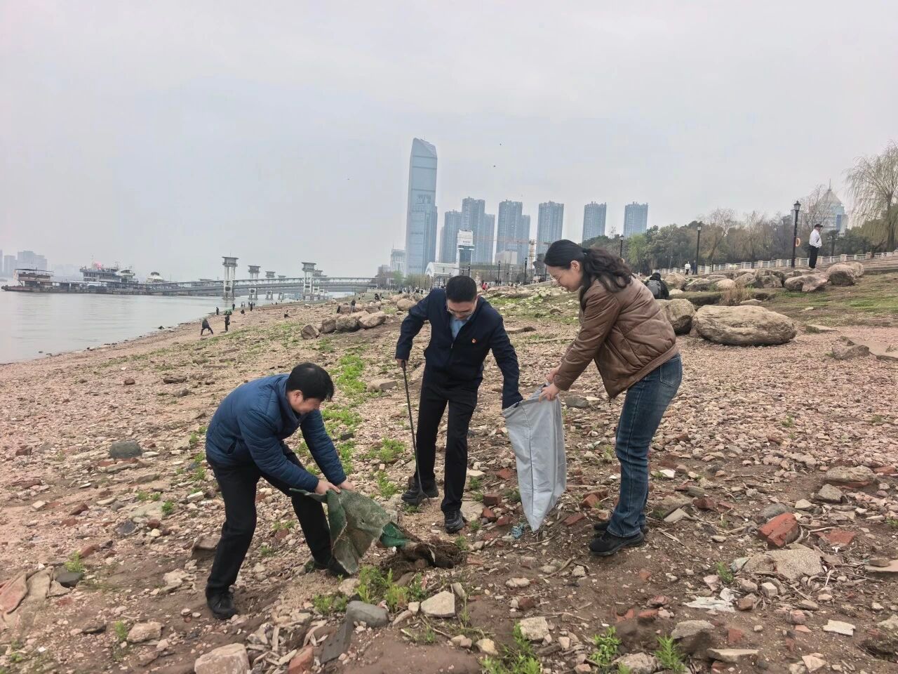 专题学习结束后,全体师生党员奔赴江滩开展“垃圾清零30平”志愿服务活动。大家手持垃圾袋、垃圾夹,分工协作、认真捡拾江滩上的塑料瓶、塑料袋、烟头、纸屑等各类垃圾。劳动中,党员们不怕脏、不怕累,以实际行动清理江滩环境,用双手守护长江岸线的整洁。