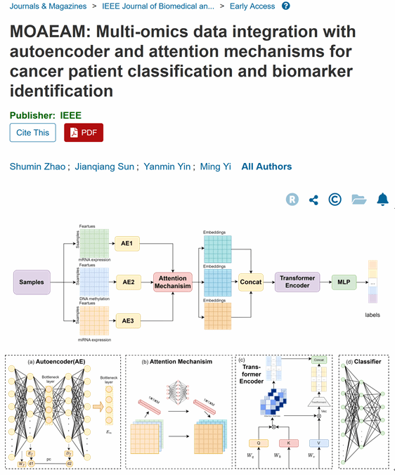 多组学数据整合对癌症患者分类与生物标志物识别至关重要。尽管这种整合展现出巨大潜力,但其发展亟需建立精密的方法学框架。现有方法在同时满足组学特异性特征提取与跨组学关联建模需求方面仍存在显著提升空间。研究团队提出一种基于改进自编码器与注意力机制的深度学习框架“MOAEAM”以解决该问题。研究中提出了新颖的复合损失函数,有助于提取组学特异性特征,同时基于多组学整合模块通过捕捉跨组学信息共同提升分类性能。在构建组学自编码器时,为每个自编码器都结合特定的分类器,并采用了新颖的复合损失函数来优化分类性能,同时保留原始数据的结构特征。自编码器对所有组学数据进行降维处理后,通过注意力机制增强嵌入信息,然后对增强后的信息进行整合,整合后的结果包含组间和组内信息。在多组癌症数据集上的系统性评估表明,MOAEAM相较当前主流多组学整合方法能持续获得更优的分类性能。消融实验揭示,改进自编码器中引入的辅助分类器对性能提升起关键作用。通过模型计算的特征重要性评分可识别具有潜在临床意义的生物标志物,这些标志物已通过文献分析和富集分析得到进一步验证。该研究成果近日发表于《IEEE Journal of Biomedical and Health Informatics》,题为:“MOAEAM: Multi-omics data integration with autoencoder and attention mechanisms for cancer patient classification and biomarker identification”。 数学与物理学院2023级应用统计硕士生赵舒敏为该文的第一作者,易鸣教授为通讯作者。