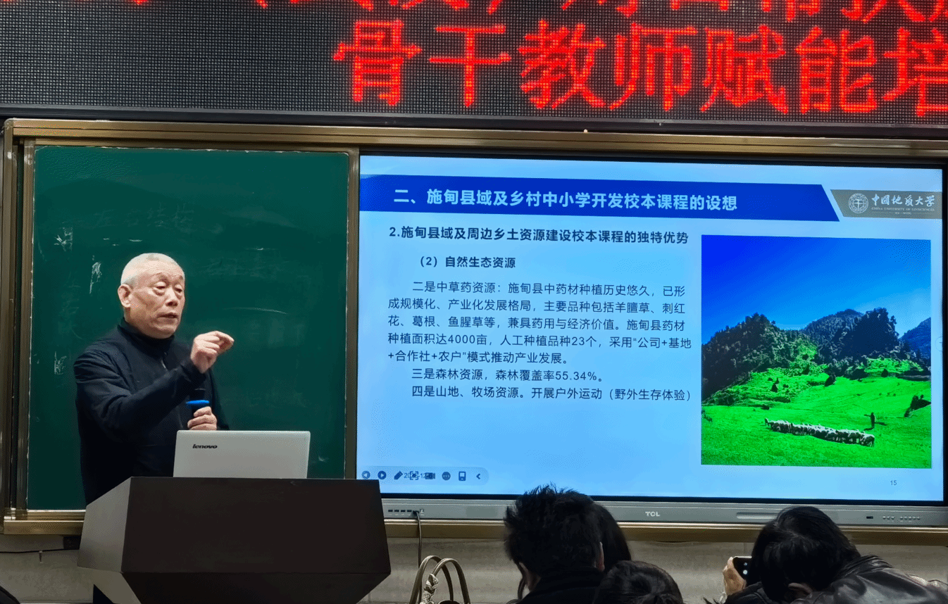 学院孙文沛副院长解读了习近平总体国家安全观的深刻内涵和实践成就,分享了地大创建《国土安全》品牌思政课的实践经验,分析了施甸县中小学国土安全教育一体化建设的内容和路径,助力当地教师打开校本课程建设的新视野。