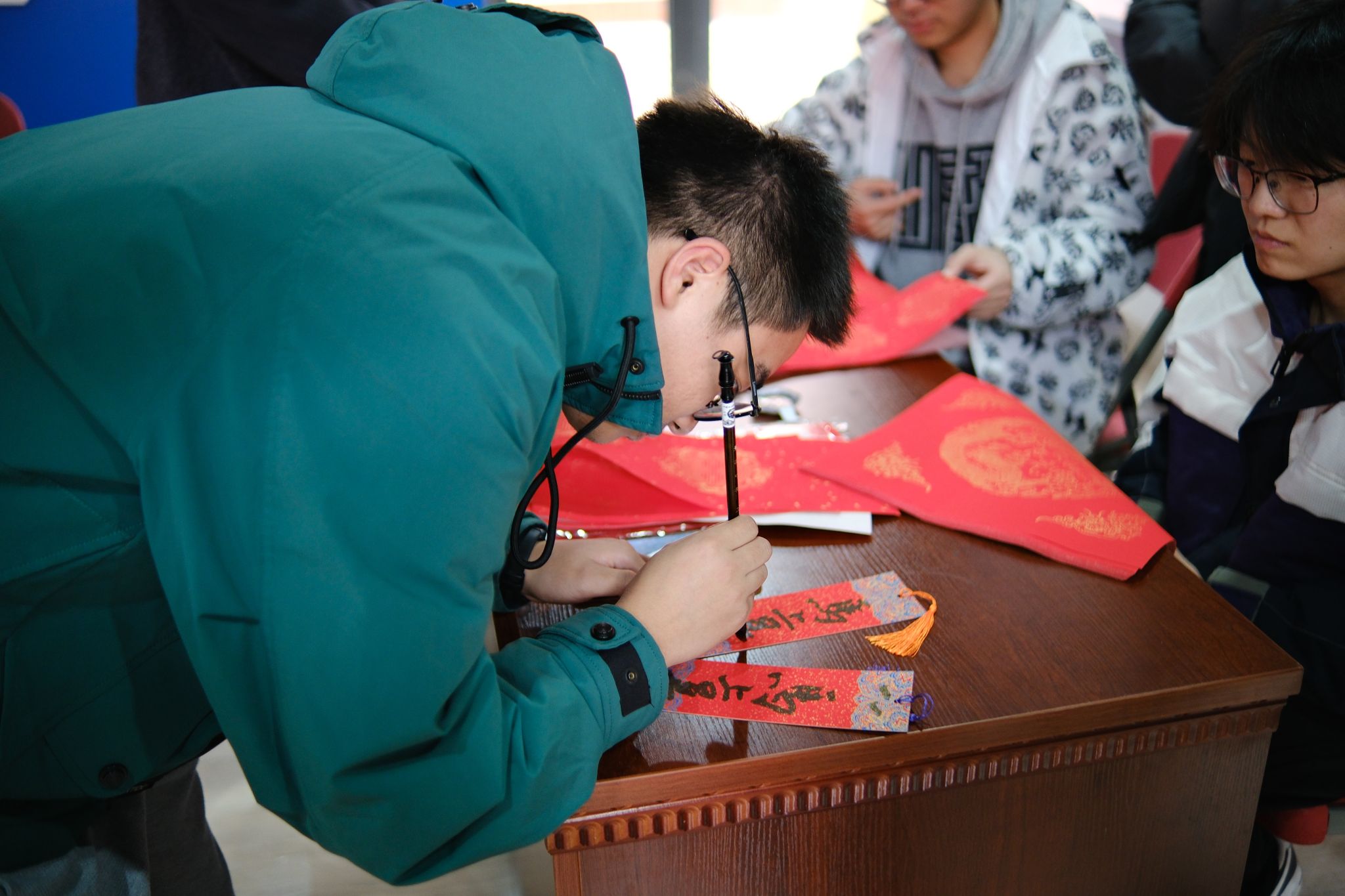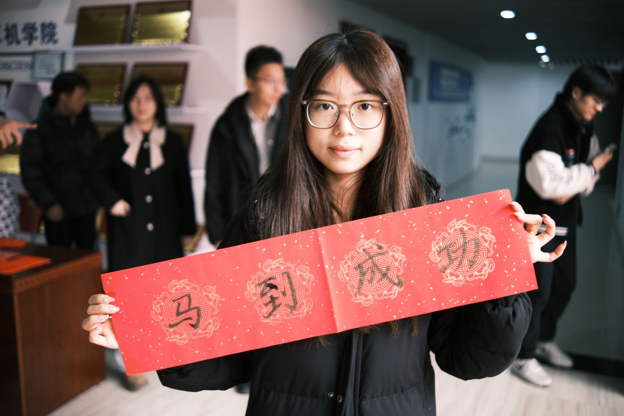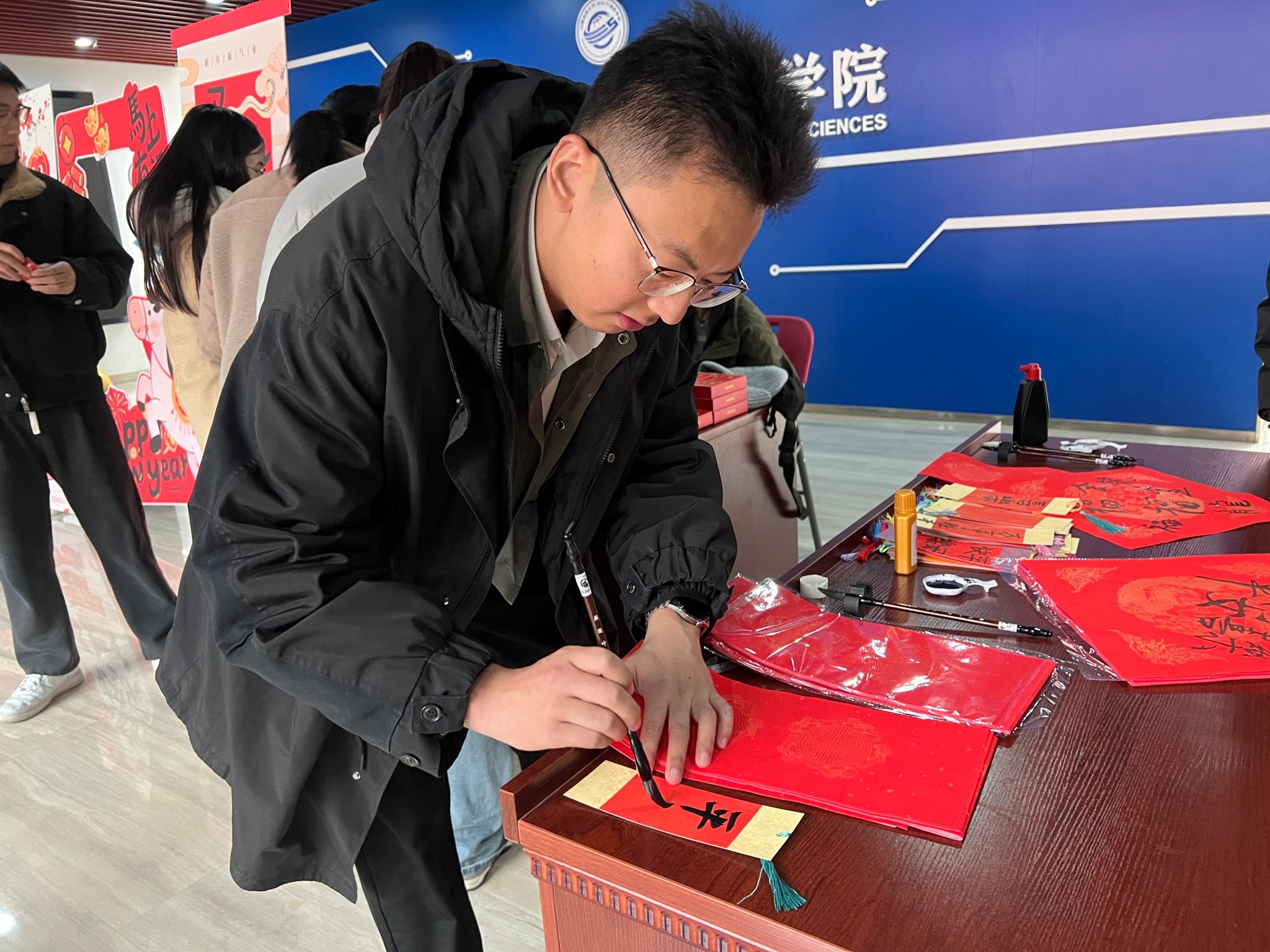 案几铺展红纸,笔墨早已备好,书法达人谭文博老师现场挥毫,笔走龙蛇间,兼具力量与美感的字迹跃然纸上。活动中,师生围聚案前,或由老师为师生定制“代码无bug,科研步步高”“算力赋能,梦想启航”等兼具专业特色与新春祝福的墨宝,或师生同执笔墨、相互切磋书写技巧。笔尖与纸面的摩挲声中,传统书法艺术的魅力悄然流淌,更将计科人的专业追求与新年期许巧妙融合,每一笔都饱含着师生对新一年的热忱祈愿,也定格了师生同心品悟传统的温情瞬间。