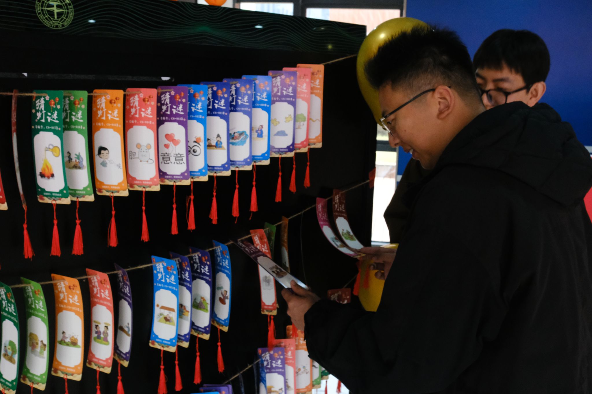 五彩斑斓的灯谜卡片挂满绳间,涵盖成语典故、诗词经典与历史常识等多元领域,每一道谜题都是一次知识与灵感的碰撞。活动中,师生打破身份界限三五成群,或驻足沉思,或轻声探讨,时而因找到解题思路而眼前一亮,时而为解开难题而携手欢呼雀跃。破解谜题后兑换小礼品的瞬间,更是将成就感与幸福感双双拉满。在欢乐互动中,大家既收获了知识的乐趣,也感受了中华传统文化的博大精深。