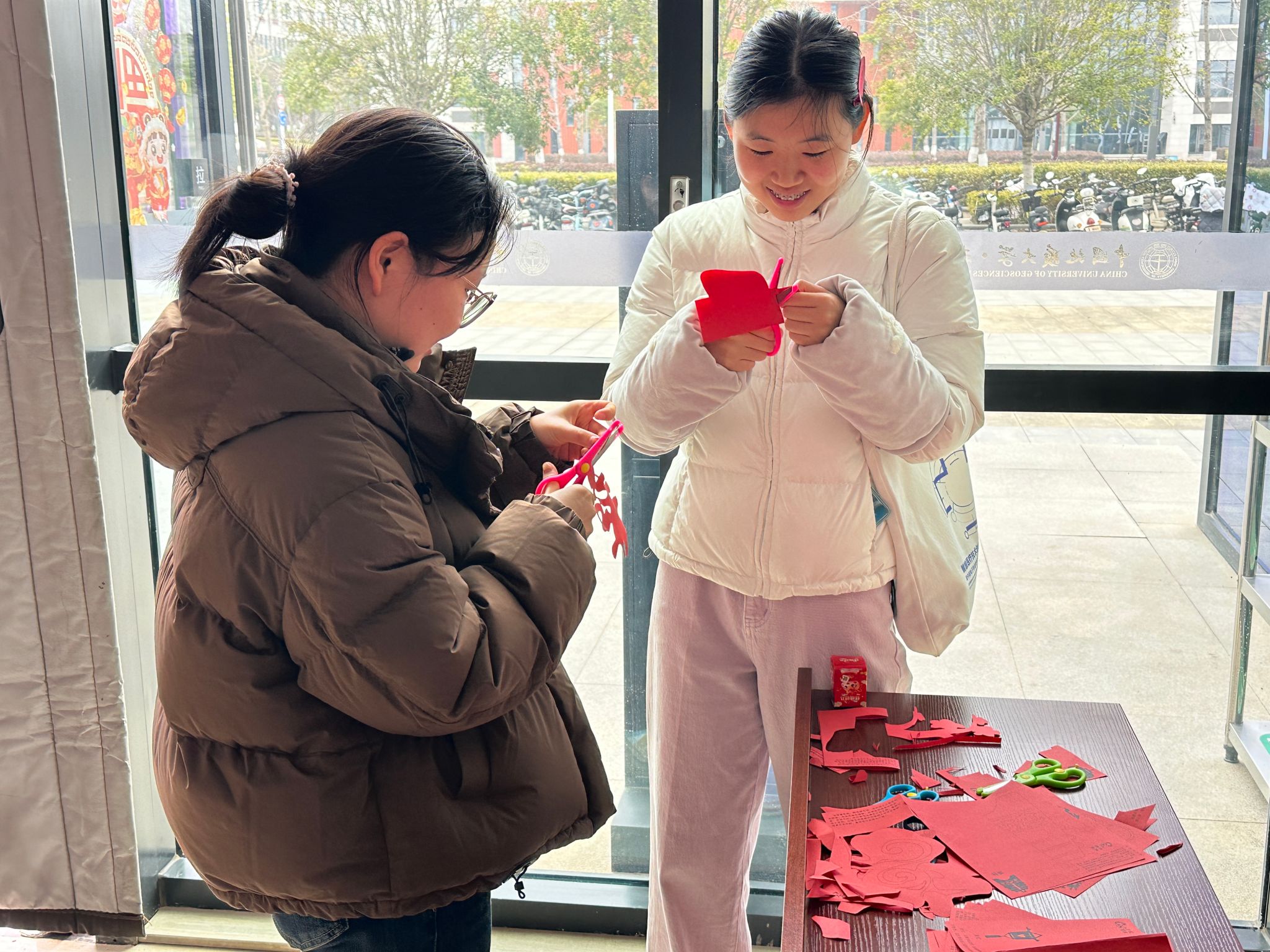 一张张喜庆的红纸在同学们手中几经折叠、剪裁,剪刀开合间,灵动的福字、精致的窗花、寓意吉祥的龙凤图案逐渐成型。现场既有老手娴熟运剪、佳作频出,也有新手虚心求教、稳步尝试,大家围坐交流技巧,分享创作灵感,红色纸屑纷飞间,不仅定格了师生共同手工制作的专注与快乐,更让非遗手工艺的独特韵味在师生互动中代代相传,每一件作品都承载着浓浓的年味与师生间的真诚祝福。