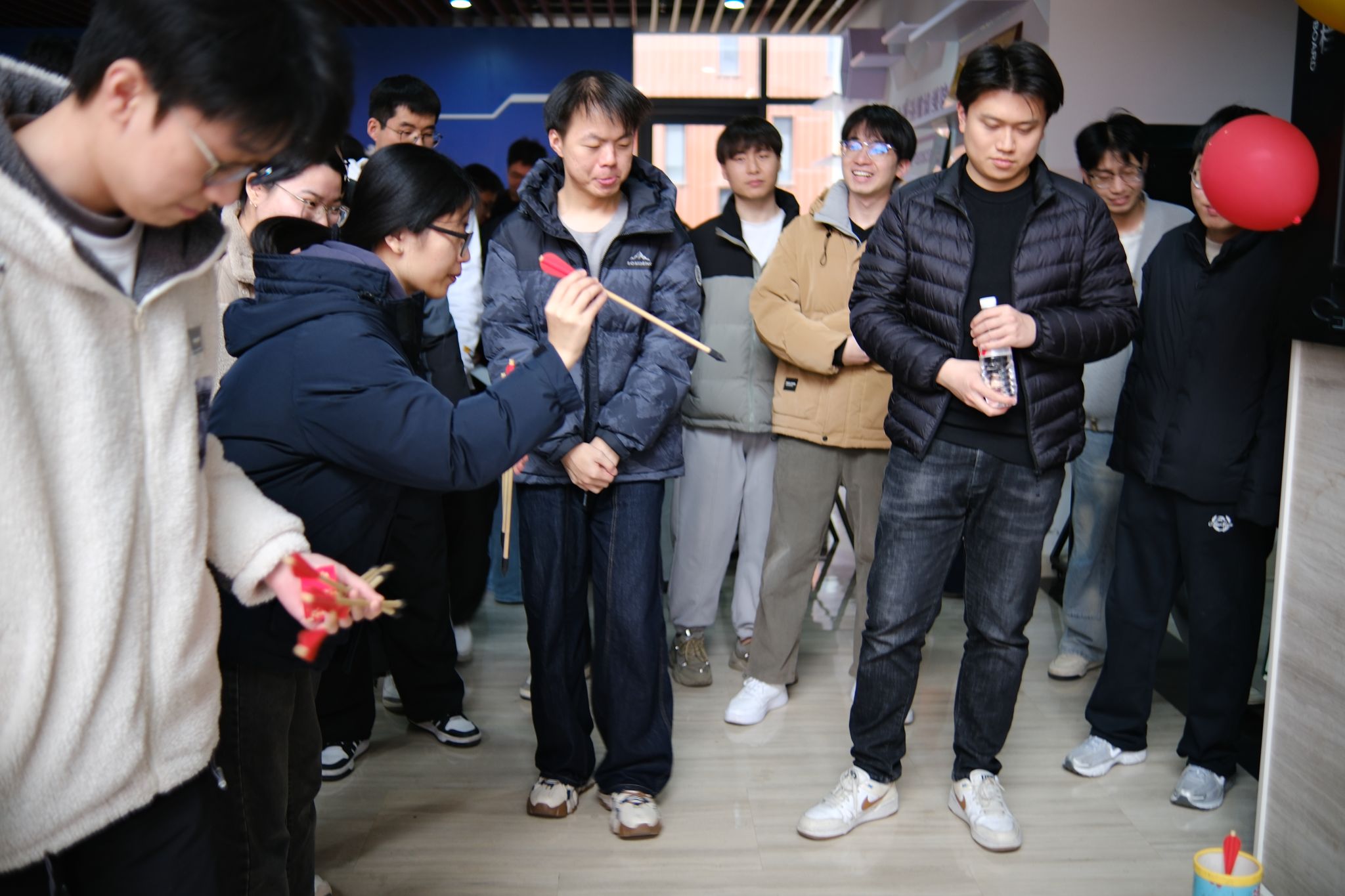作为传承千年的传统礼仪游戏,投壶区自开启便人气爆棚,师生踊跃参与、轮番上阵。参与者手持竹箭,在指定线后屏气凝神,瞄准壶口轻轻投掷。箭入壶的清脆声响响起时,现场立刻爆发出阵阵喝彩。即便偶尔失准,也会引来善意的笑声与加油声。这场兼具趣味性与仪式感的游戏,不仅考验着大家的手眼协调能力与专注力,更让师生在轻松欢笑中沉浸式感受古人的生活雅趣与礼仪文化,在并肩互动中悄然拉近了心与心的距离。