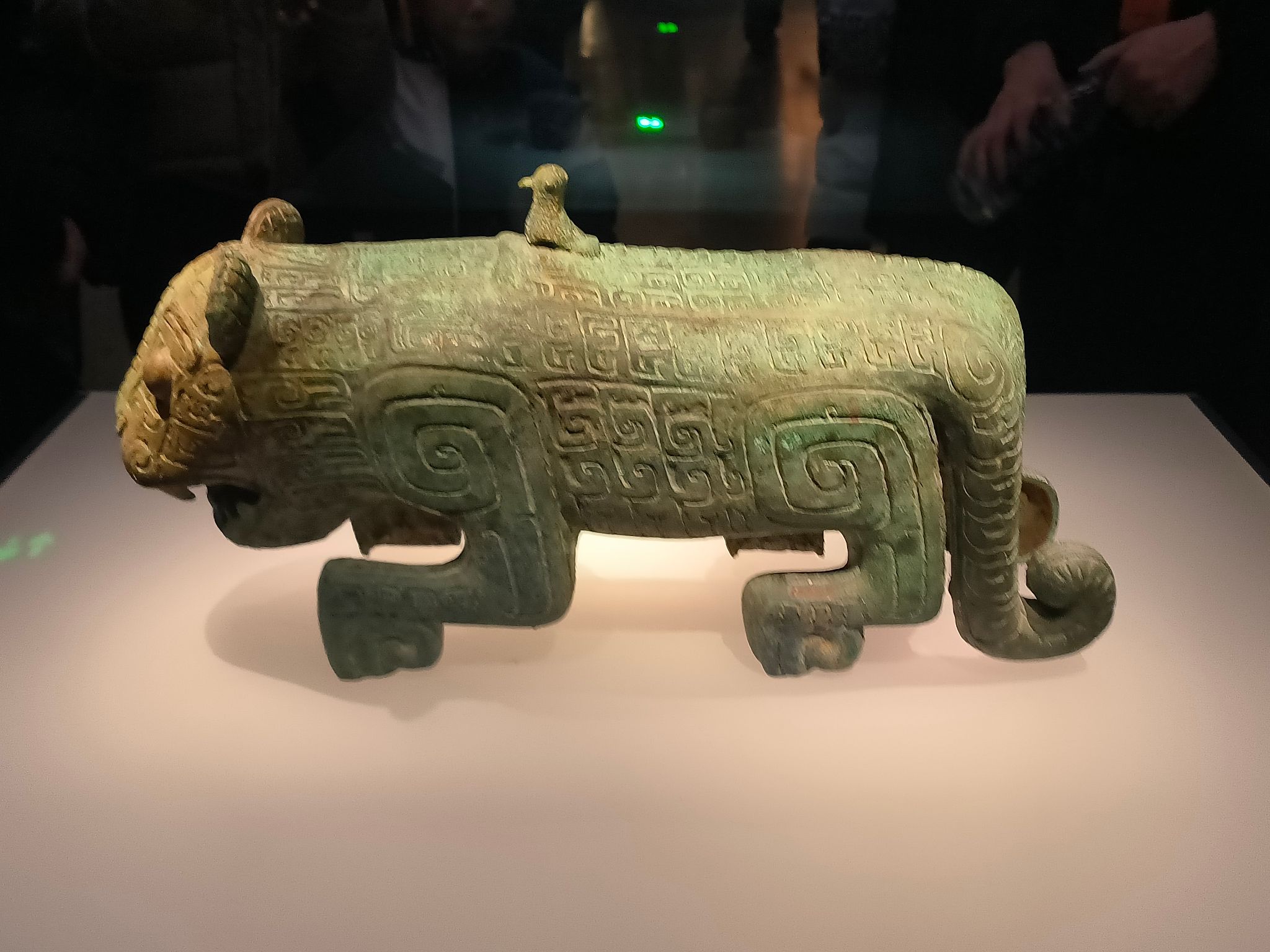 实践团在"江西古代文明展"拍摄的商代伏鸟双尾青铜虎特写。这件国家一级文物与景德镇青花瓷、白鹿洞书院展陈共同构成赣鄱文化基因图谱,为理解创新发展提供历史纵深。